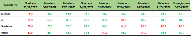 Previsão de níveis de armazenamento para final de abril/2023 (%)