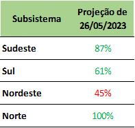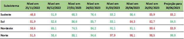 De forma geral, todos os subsistemas se mantêm com seus reservatórios em bons patamares e como destaque está a região Norte que atinge 98% de sua capacidade de armazenamento. Espera-se ainda que ao final do mês de junho/23 a mesma esteja com quase 100%.