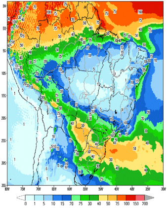 A passagem de uma frente fria na região Sul atrelada a um sistema de baixa pressão no Sul e Sudeste ocasionarão precipitações nas bacias dos rios Uruguai, Iguaçu, Paranapanema, Jacuí, Tietê, Grande e na incremental a UHE Itaipu. Pancadas de chuvas também devem continuar nas bacias dos rios Tocantins, Xingu e Madeira.