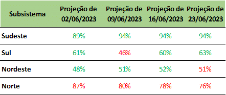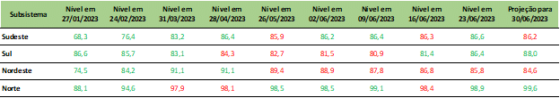 Previsão de níveis de armazenamento para final de junho/2023 (%)