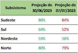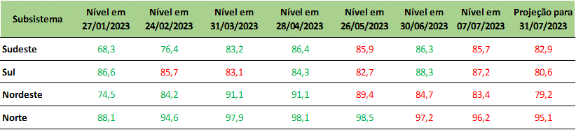 Previsão de níveis de armazenamento para final de julho/2023 (%)
