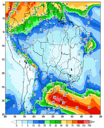 As precipitações devem ocorrer principalmente nas bacias dos rios Iguaçu, Paranapanema, Jacuí, Uruguai, no trecho incremental a UHE Itaipu e alguns pontos da bacia do rio Tietê devido a uma frente fria esperada nas regiões Sul e Sudeste.