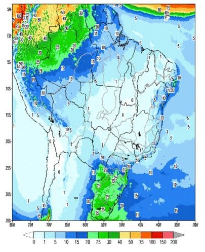 A passagem de uma frente fria seguida pela atuação de áreas de instabilidade na região Sul ocasiona precipitação nas bacias dos rios Jacuí, Uruguai, Iguaçu e em pontos isolados do Paranapanema e do trecho incremental a UHE Itaipu na próxima semana