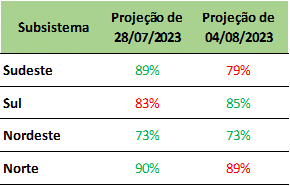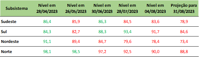 Projeção para o mês de agosto/23 é de redução nos níveis de armazenamento em todos os submercados.