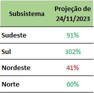 Os reservatórios do subsistema Sul apresentam um aumento de mais de 6% se comparado a semana anterior devido às chuvas volumosas na região. Os demais subsistemas seguem com níveis entre 49% e 64%. Projeta-se ainda que em dezembro os reservatórios do sul atinjam 87% de sua capacidade de armazenamento.