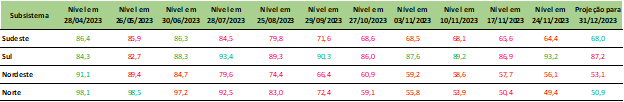 Previsão de níveis de armazenamento para final de dezembro/2023 (%)