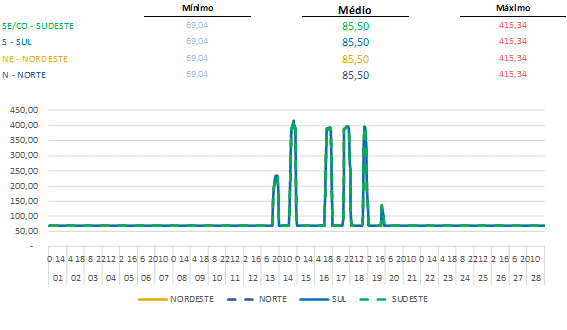 Ontem (27), a CCEE divulgou a Função de Custo Futuro – FCF a qual indica preços baixos nessa semana (25/11 a 01/12) em todos os submercados, sem oscilações.