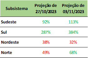 Como destaque está o Sudeste que poderá finalizar o mês de novembro com 69,9% de sua capacidade de armazenamento. Projeta-se que os demais atinjam níveis compreendidos entre 47,1% e 64%.