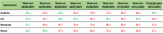 Previsão de níveis de armazenamento para final de novembro/2023 (%)