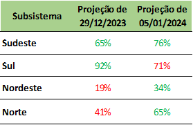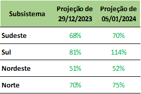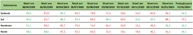 Previsão de níveis de armazenamento para final de janeiro/2024 (%)
