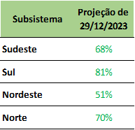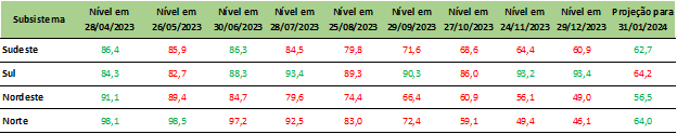 Previsão de níveis de armazenamento para final de janeiro/2024 (%)