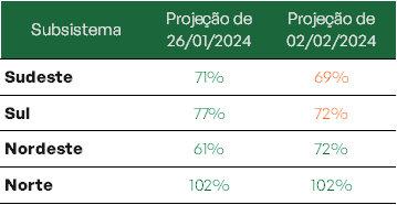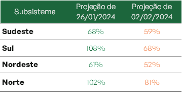 Projeta-se ainda que ao final do mês em curso, estejam com níveis acima de 90%. Já para o Sul, a previsão é que atinjam 59%.
