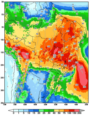 Precipitações devem ocorrer nas bacias das regiões Norte, Nordeste, Sudeste e Centro-Oeste devido a atuação de uma frente fria no Espírito Santo e sul da Bahia. Já na região Sul, áreas de instabilidades causarão chuva fraca.