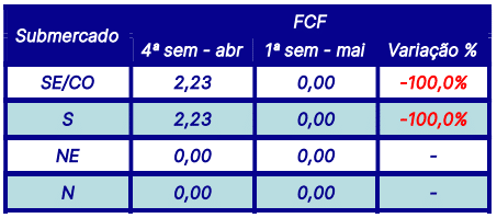 Para a semana em curso (27/04 a 03/05), a Função de Custo Futuro – FCF também divulgada pela CCEE, na última segunda-feira (29), indica preços baixos em todos os submercados.