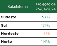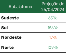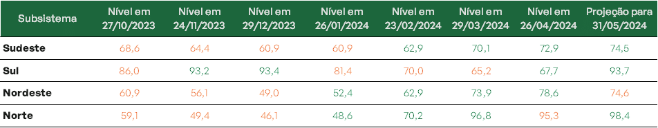 Os bons volumes de chuva realizados têm contribuído para o aumento nos níveis dos reservatórios de todos os subsistemas. Projeta-se ainda que a capacidade de armazenamento de todos os reservatórios esteja acima de 74% ao final do mês de maio.