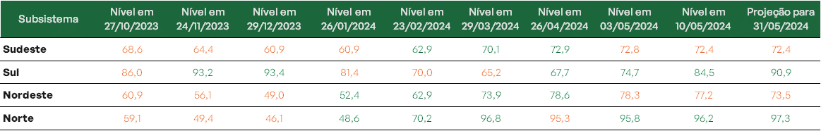 Ao final do mês em curso, estima-se que os níveis dos reservatórios de todos os subsistemas estejam acima de 72%.