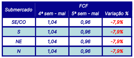 Na última sexta-feira (24), a CCEE também divulgou a Função de Custo Futuro – FCF para a semana em curso (25/05 a 31/05), a qual vem mostrando preços baixos em todos os submercados com variações fechando em R$/MWh 0,96.