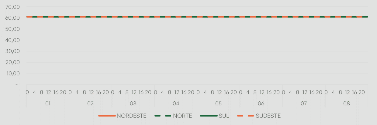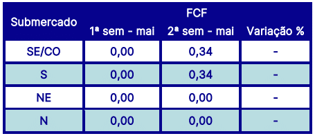 Também divulgada pela CCEE na última sexta-feira (03), a Função de Custo Futuro – FCF vem apontando, para essa semana em curso (04/05 a 10/05), preços baixos em todos os submercados.