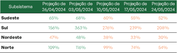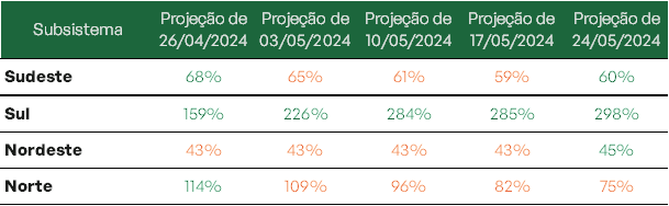 Os bons volumes de chuva já realizados têm contribuído para o aumento constante nos níveis dos reservatórios do subsistema Sul. Ao final do mês de maio, estima-se que as regiões Norte e Sul alcancem 97% e 90,5% de seus níveis, respectivamente.