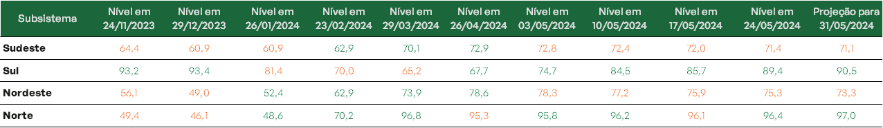 Previsão de níveis de armazenamento para final de maio/2024 (%)