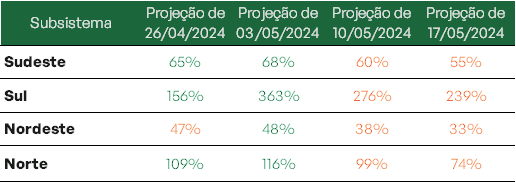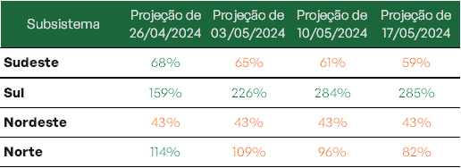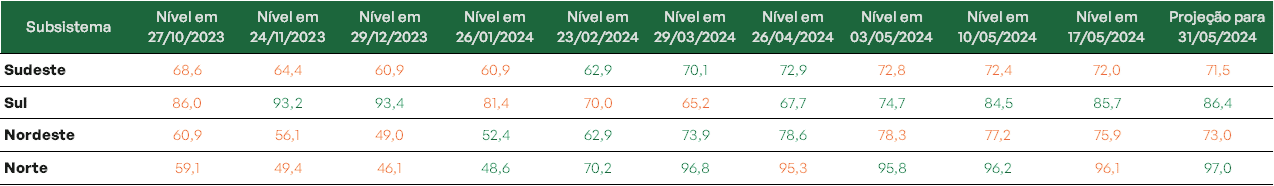 As regiões Norte e Sul se destacam uma vez que atingem, nessa ordem, 96,1% e 85,7% de sua capacidade de armazenamento. Projeta-se ainda que ao final de maio, os níveis do Norte estejam em 97%.