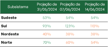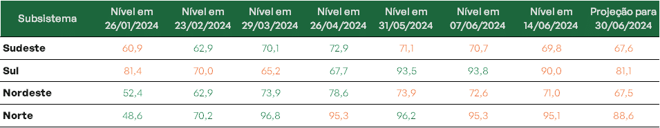Previsão de níveis de armazenamento para final de junho/2024 (%)