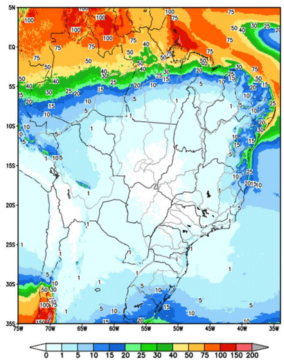 Espera-se que durante o mês, as precipitações na região Sul atinjam 123% da Média de Longo Termo – MLT. Já as médias para as demais regiões devem ficar compreendidas entre 38% e 60%.