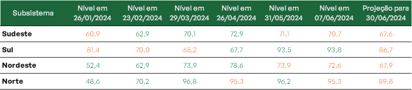 A região Sul segue como destaque uma vez que atinge 93,8% de sua capacidade de armazenamento. Projeta-se que ao final do mês em curso, as regiões Norte e Sul estejam com seus níveis em 89,8% e 86,7%, nessa ordem.
