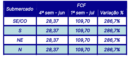 A Função de Custo Futuro – FCF, também divulgada pela CCEE na última segunda-feira (01), apresenta para a semana em curso (29/06 a 05/07), subida de preços em todos os submercados com variações fechando em R$/MWh 109,70 em todos os submercados.