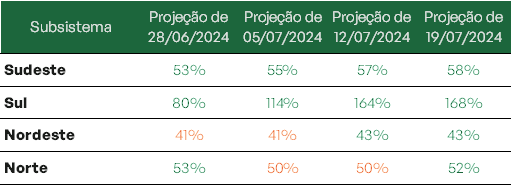 Se comparado a última semana, o subsistema Sul apresenta um aumento considerável em seus níveis, operando com quase 88% de sua capacidade. Ao final do mês, estima-se que os reservatórios de todos os subsistemas estejam com níveis acima de 60%.