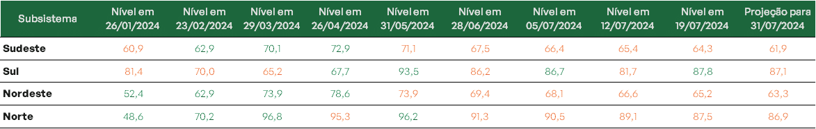 Previsão de níveis de armazenamento para final de julho/2024 (%)