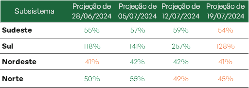 Em nova projeção espera-se uma melhora na expectativa de chuva para o mês de julho, principalmente nas regiões Sul e Sudeste, as quais devem atingir 168% e 58% da Média de Longo Termo – MLT, respectivamente.