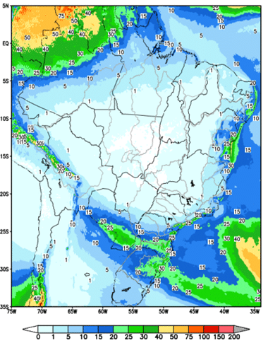 Nessa semana, uma frente fria ocasiona chuva fraca nas bacias dos rios Iguaçu, Taquari-Antas, em alguns pontos do Paranapanema, Jacuí, Uruguai e no trecho incremental a UHE Itaipu.
