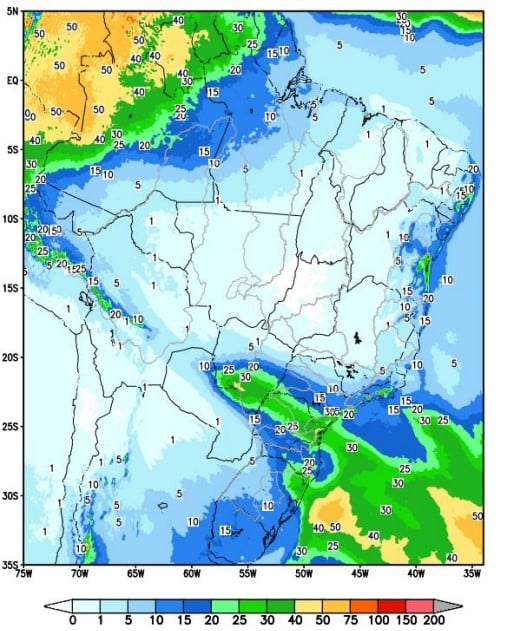 No início da semana, na Região Sul e Sudeste, espera-se que essas condições provoquem precipitação nas bacias dos rios Jacuí, Taquari-Antas, Uruguai, Paranapanema, Tietê e em alguns pontos isolados da bacia do Paraíba do Sul.