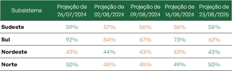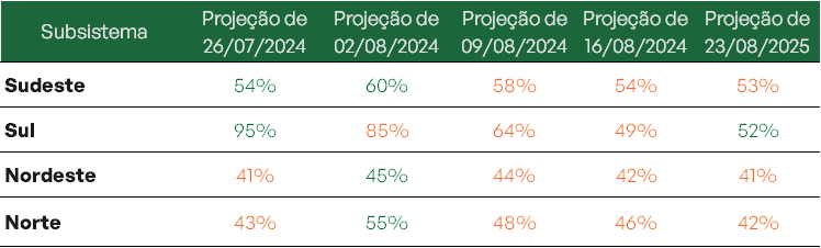 Em nova projeção, os maiores volumes de precipitações deste mês devem ocorrer na região Sul, os quais podem alcançar 62% da Média de Longo Termo – MLT. Para as demais regiões, espera-se que as médias fiquem compreendidas entre 43% a 58%.