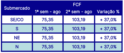 A Função de Custo Futuro – FCF divulgada na última sexta-feira (02) pela CCEE, indica aumento de preços em todos os submercados para a semana em curso (03/08 a 09/08), os quais devem chegar a R$/MWh 103,19 devido a piora na previsão de chuvas para o mês de agosto.