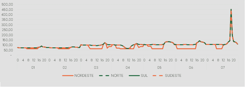 Estima-se que na hora 18 do dia de hoje os preços atinjam o pico, chegando a quase R$/MWh 452,00.