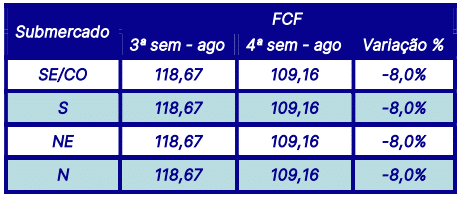 A Função de Custo Futuro – FCF também divulgada pela CCEE na última sexta-feira (16), aponta redução nos preços para a semana em curso (17/08 a 23/08), com variação de 8% em todos os submercados, fechando a R$/MWh 109,16.