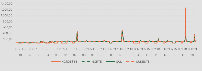 No Norte, Sul e Sudeste os valores estão próximos a R$/MWh 115,00, enquanto o Nordeste continua como exceção mantendo o descolamento de preços entre os submercados e atingindo quase R$/MWh 105,00.