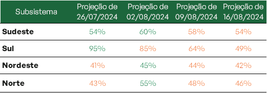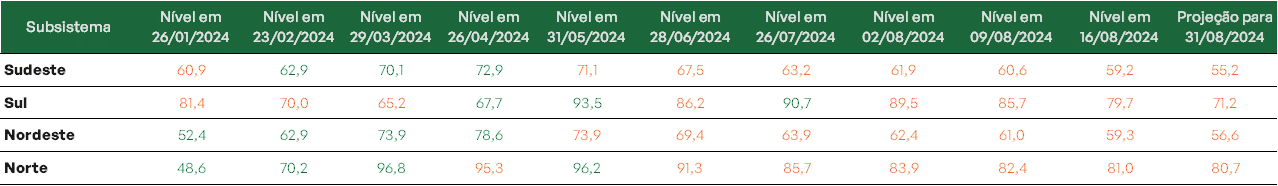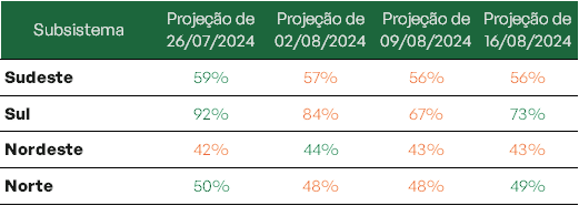 Ainda assim, todos os subsistemas se mantêm com boa capacidade de armazenamento, atingindo volumes acima de 59%. Ao final do mês de agosto estima-se que os subsistemas Norte e Sul sejam ainda os destaques mantendo níveis acima de 70%.