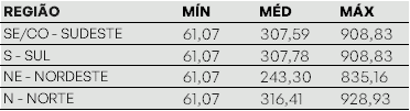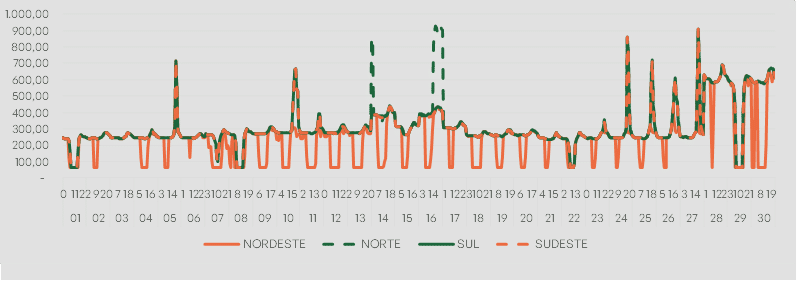No submercado Nordeste, a geração solar faz com que os preços se mantenham com uma curva menos acentuada se comparado aos demais. Sul e Sudeste apresentam-se com valores próximos a R$/MWh 308,00, enquanto o Norte chega a quase R$/MWh 317,00.