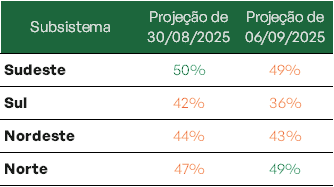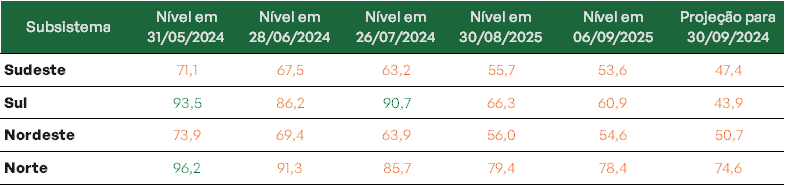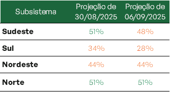 Para o final de setembro, a projeção é que apenas o subsistema Norte esteja com sua capacidade de armazenamento acima de 74%. Já os demais devem atingir níveis próximos aos 50%. Essa queda esperada pode ser explicada devido a baixa previsão de chuvas para o período.