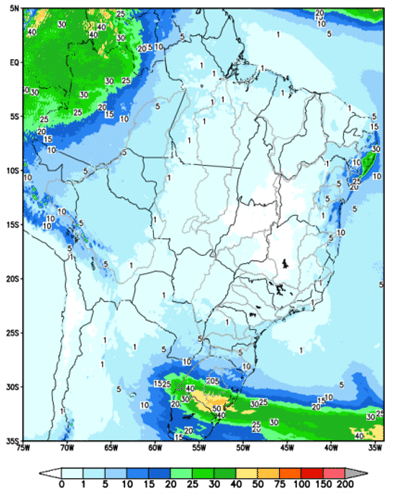 Nessa semana, as precipitações restringem-se ao Rio Grande do Sul em virtude de um sistema de alta pressão na região Sudeste.