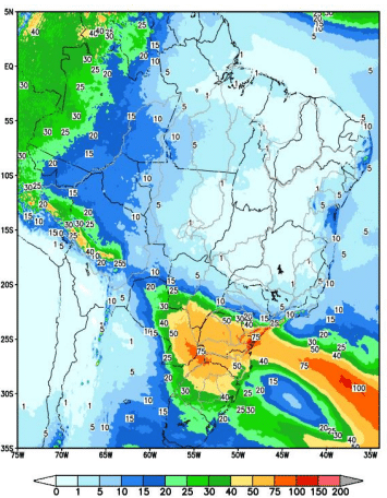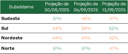 Em nova projeção, espera-se que os maiores volumes de precipitações ocorram no Sul do país, chegando a 53% da Média de Longo Termo – MLT. Os volumes para as demais regiões devem estar compreendidos entre 42% a 49%.