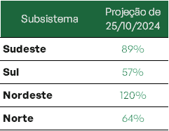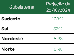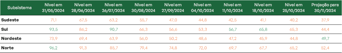 Os subsistemas Sul e Norte se destacam operando com 65% de sua capacidade de armazenamento. Ao final de novembro, espera-se que os volumes do Norte e Nordeste fiquem em torno de 50%.
