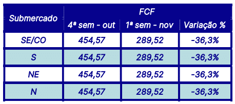 Também na última segunda-feira (28), a CCEE divulgou a Função de Custo Futuro – FCF que indica uma boa redução nos preços para toda a semana em curso (26/10 a 01/11) em razão dos bons volumes de precipitações esperados para o mês em curso.