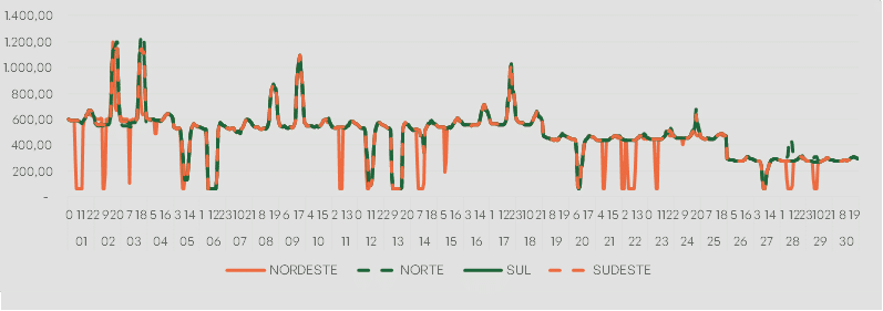 O Nordeste se mantém com a condição de preços mais baixos em função do impacto da geração de energia solar em determinados horários do dia, o que explica essa diferença de valores.
