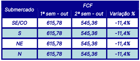 Na última sexta-feira (04), a Função de Custo Futuro – FCF também divulgada pela CCEE, aponta redução de mais de 10% nos preços esperados para a semana em curso (05/10 a 11/10) se comparado a semana anterior, fechando próximo a R$/MWh 545,00 em todos os submercados.