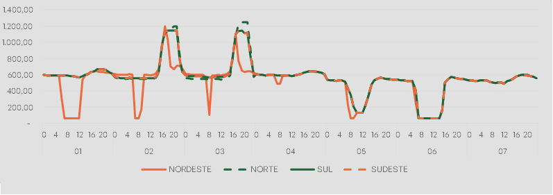 O Nordeste segue com característica de descolamento apresentando uma curva de preços mais baixa se comparado aos demais submercados.
