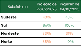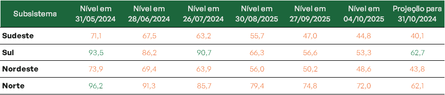Sudeste, Sul e Nordeste operam com volumes próximos a 50%, enquanto o Norte atinge 72% de sua capacidade de armazenamento. Estima-se ainda que até o final do mês, as regiões Norte e Sul estarão com níveis superiores a 62%, destacando-se como as mais positivas em termos de armazenamento.